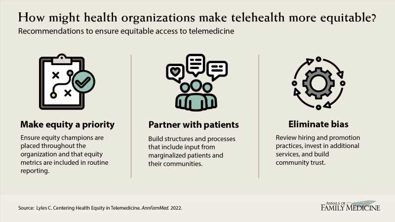 Using the Institute for Healthcare Improvement as a benchmark, the authors present strategies to advance equity within a healthcare organization across the domains of: 1) making health and racial/ethnic equity in telemedicine a strategic priority, including having committed leaders across the organization and using robust data to identify disparities; 2) building structures and processes to support telemedicine equity, including ensuring more direct input from marginalized patients; 3) deploying telemedicine strategies to address social determinants of health and access barriers to telemedicine; 4) eliminating institutional racism in telemedicine provision, such as hiring and retaining a health care workforce that reflects the diversity of the patients served and; 5) partnering with patients and community organizations to implement telemedicine.