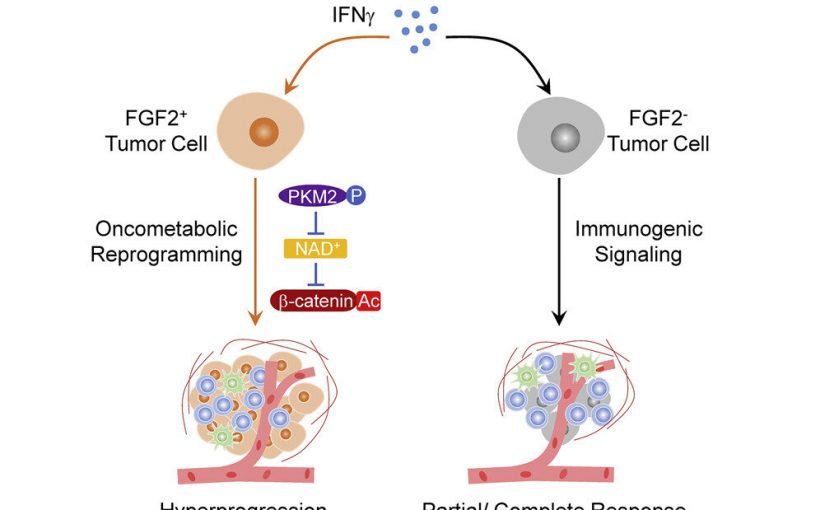 They found that tumors with hyperprogression after immunotherapy exhibited elevated levels of fibroblast growth factor 2, known as FGF2, and beta-catenin signaling. Further, the mouse models showed that the gene signaling interferon γ, derived from CD8+ T cells, leads to hyperprogression disease by rewiring the tumors’ metabolic pathways.