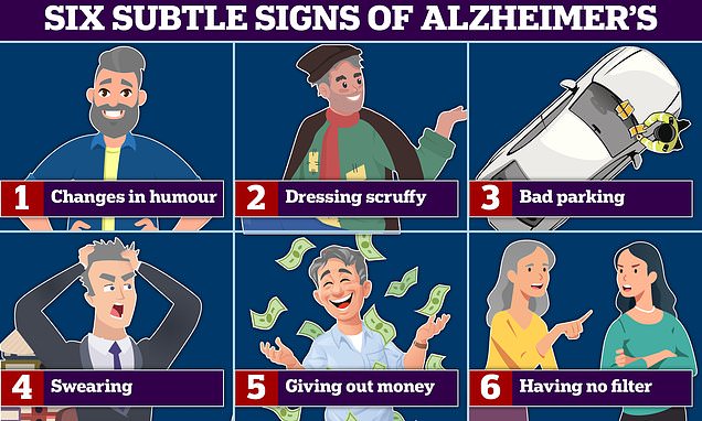 Changes in humour and swearing more are all signs of Alzheimer’s and frontotemporal dementia (FTD) — a type of dementia that causes problems with behaviour and language. According to experts bad parking, and dressing scruffy are also signs of the memory-robbing disease. Graphic shows: Six signs of Alzheimer’s disease