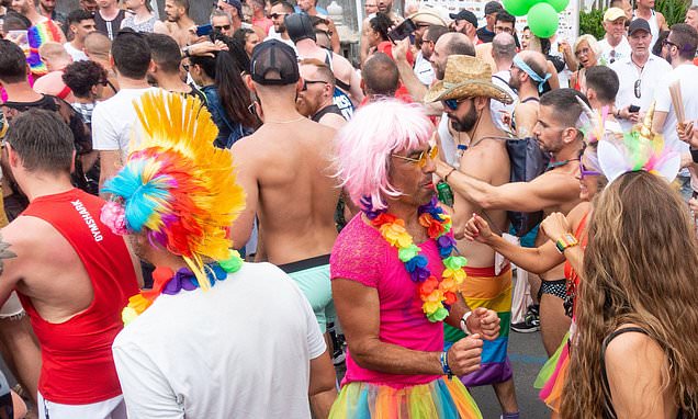 Gay men should try a ‘gloryhole fantasy’ or mutual masturbation instead of regular sex to limit the spread of monkeypox, the LGBT Foundation has urged. Pictured: The Gran Canarian pride festival, held between May 5 and 15 and attended by 80,000 people from Britain and across Europe, is being investigated after being linked to numerous monkeypox cases