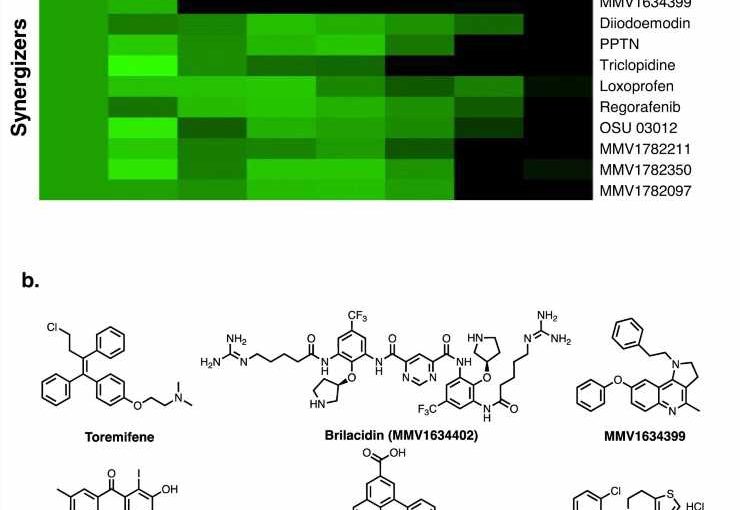 ![Screening of repurposing chemical libraries identify several compounds that enhance or synergize caspofungin activity. a) Heat map of % of metabolic activity using Alamar blue. The % of activity is based on A. fumigatus grown for 48 hs at 37 °C in the absence or presence of a specific compound (MM + CAS [0.2 µg/mL] or MM + enhancers or synergizers alone [20 µM], or a combination of MM containing CAS [0.2 µg/mL]) and added of enhancer or synergizers [0.6–20 µM] divided by the control (MM), both grown for 48 h at 37 °C. The results are the average of three independent experiments analyzed in technical duplicates each. Heat map scale and gene identities are shown. b) Chemical structures of the CAS synergizers. Credit: Nature Communications (2023). DOI: 10.1038/s41467-023-37573-y Novel compound combats drug-resistant fungi when combined with commercially available medications](https://scx1.b-cdn.net/csz/news/800a/2023/novel-compound-combats-1.jpg)