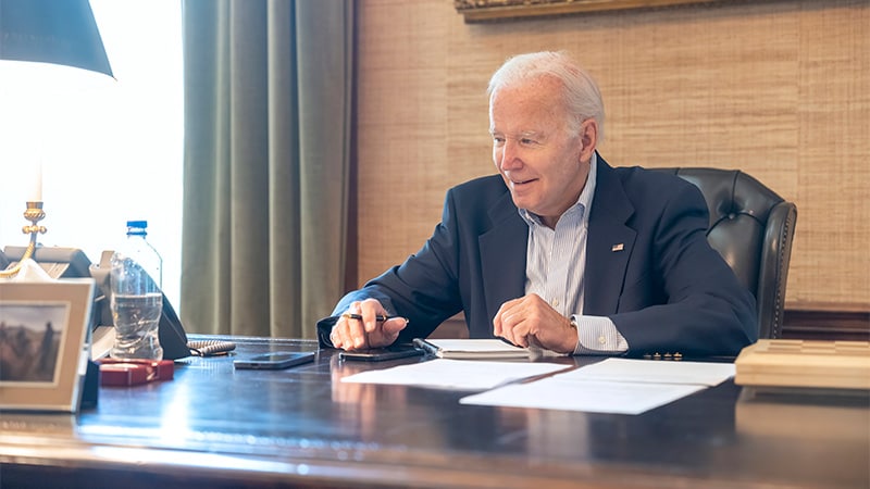 President Joe Biden speaks with Sen. Bob Casey, D-Pa., on the phone from the Treaty Room in the residence of the White House.